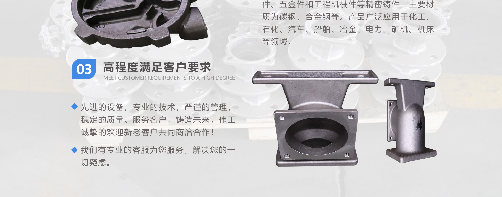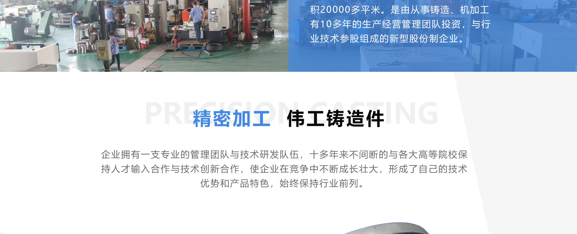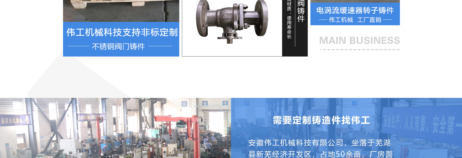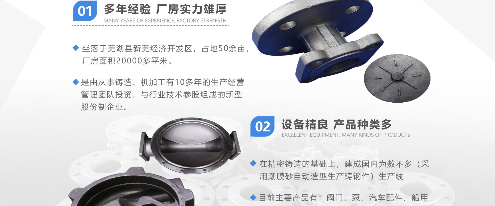 安徽偉工機械科技有限公司,坐落于安徽蕪湖新蕪經(jīng)濟(jì)開發(fā)區(qū),是一家専業(yè)從事鑄造產(chǎn)品設(shè)計、研發(fā)、生產(chǎn)、銷售于一體的企業(yè),公司為客戶的產(chǎn)品提供多樣的技術(shù)支持與設(shè)計,公司主要鑄造技術(shù)有潮模砂鑄造、硅溶膠精鑄工藝。主要產(chǎn)品有:不銹鋼閥門配件、泵閥配件、汽車配件、工業(yè)管道配件、工程機械配件、汽車配件等。材質(zhì)為:低合金鋼、304、316、316L、鉻鉬鋼、哈氏合金、碳鋼、雙相鋼等。公司已先后通過ISO9001和TS16949等多種體系審核,以完備的管理手段和齊全的檢測設(shè)備滿足客戶需求,進(jìn)的設(shè)備,専業(yè)的技術(shù),嚴(yán)謹(jǐn)?shù)墓芾恚€(wěn)定的質(zhì)量。服務(wù)客戶,鑄造未來,偉工誠摯的歡迎新老客戶共同商洽合作
